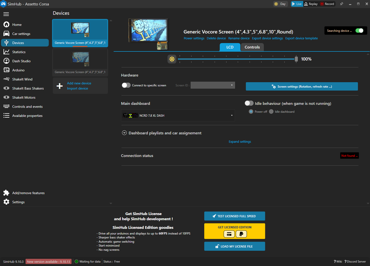 5. In the Devices section on the left menu select "Generic Vocore Screen" and under the "Main Dashboard" tab select your dashboard of choice. It should now open when you open whichever SIM you are running.